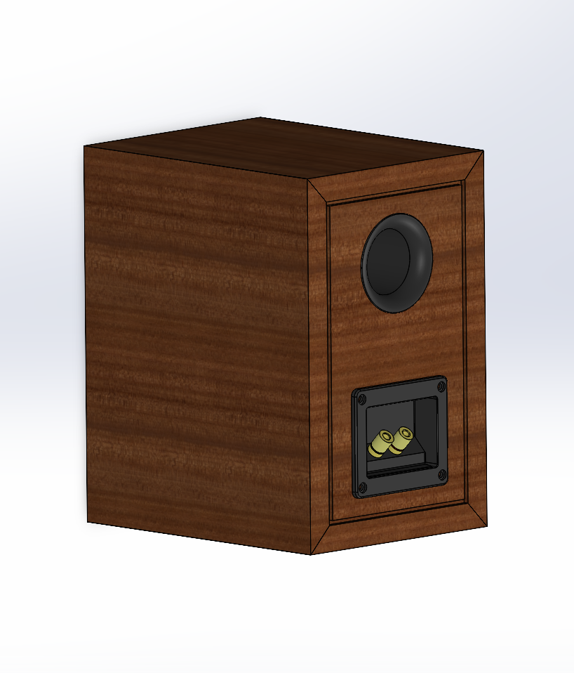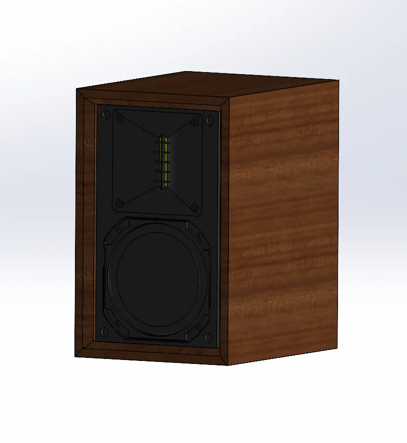 I selected the Faital Pro 5FE120 mid-range driver and Beston RT002A ribbon tweeter based on the Argos TM bookshelf speaker design guide. While I followed an existing crossover circuit diagram due to equipment limitations, I designed the entire enclosure from scratch in Solid Works and AutoCAD, maintaining only the required internal chamber volume for acoustic performance.