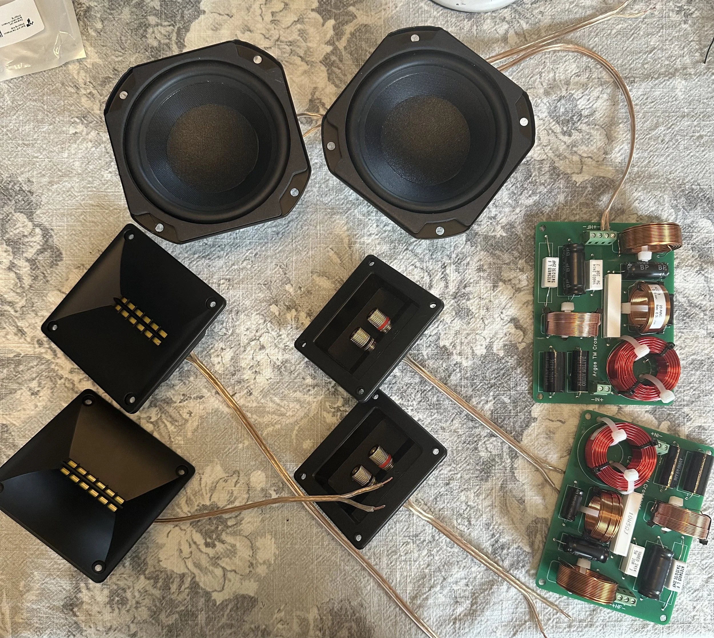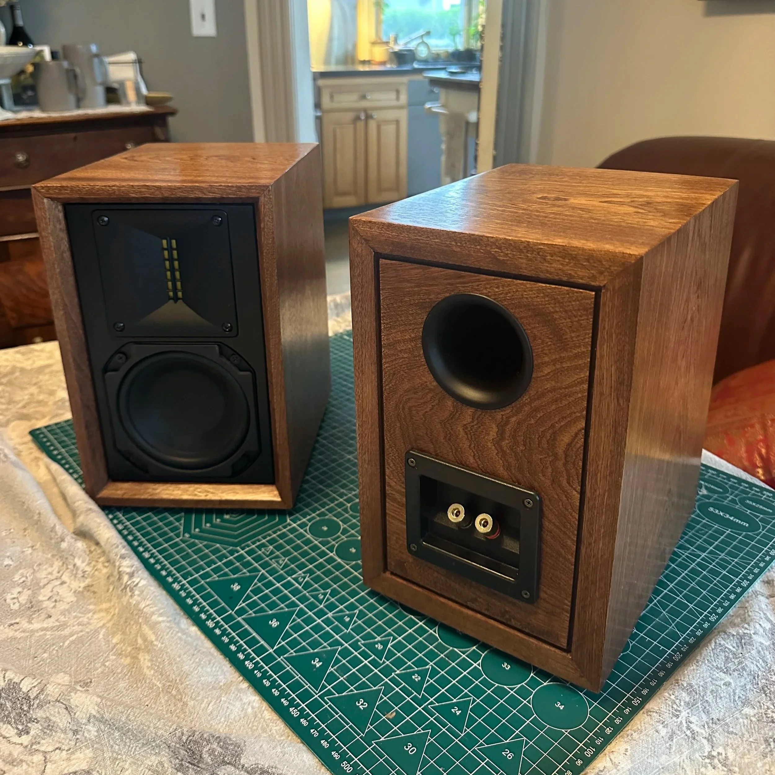 I hand-soldered the crossover circuit following the provided diagram. The mahogany panels were finished with progressive sanding and oil treatment, while the MDF front panel was spray painted. I designed and 3D printed custom grille frames that hold acoustically transparent fabric and attach via embedded magnets.