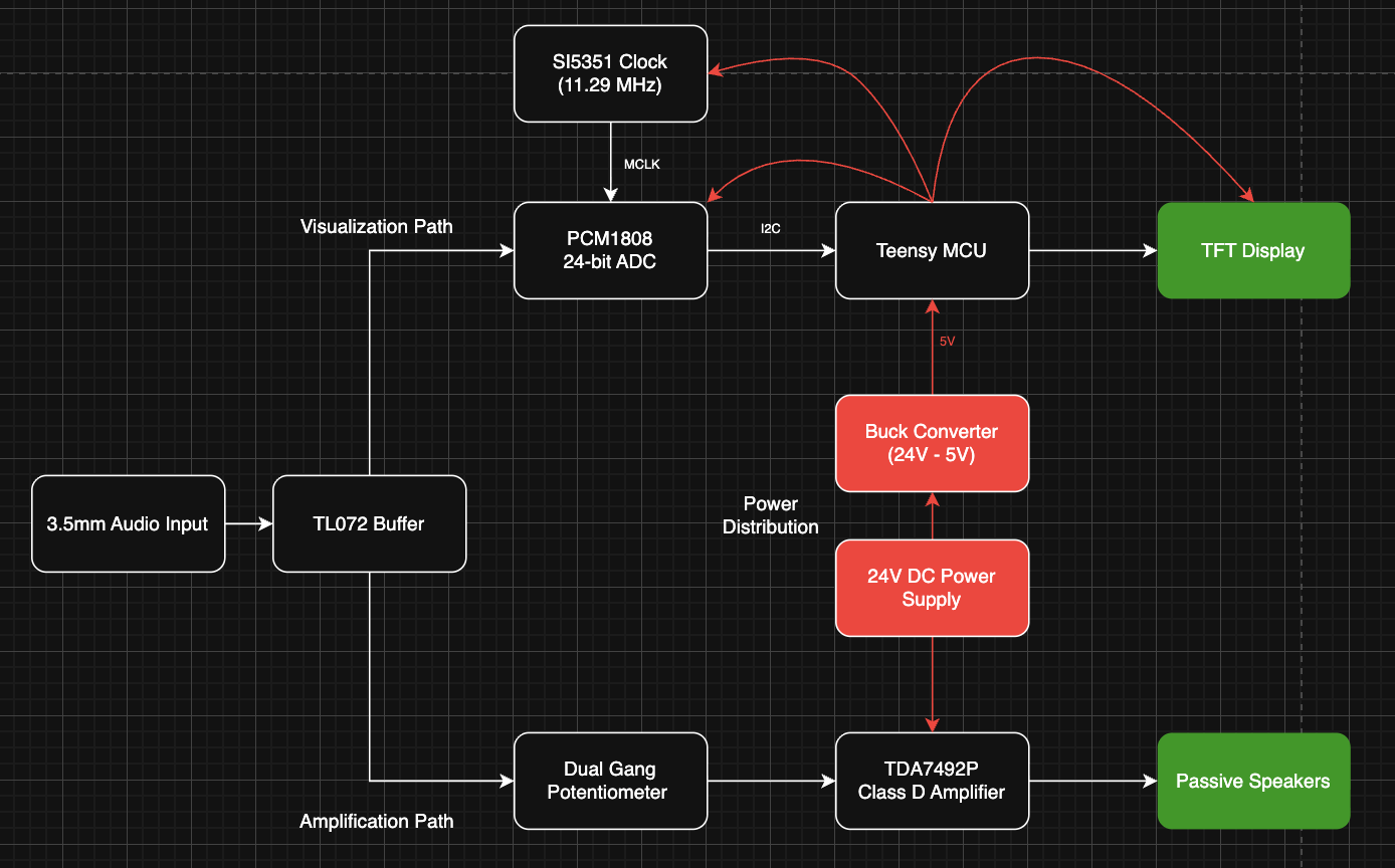 Circuit design and debugging, embedded DSP programming (C/C++), I2S/SPI communication protocols, analog audio design, CAD design (SolidWorks), 3D printing, breadboard prototyping, oscilloscope debugging, power distribution architecture, system integration, FFT algorithm implementation, component selection and specification
